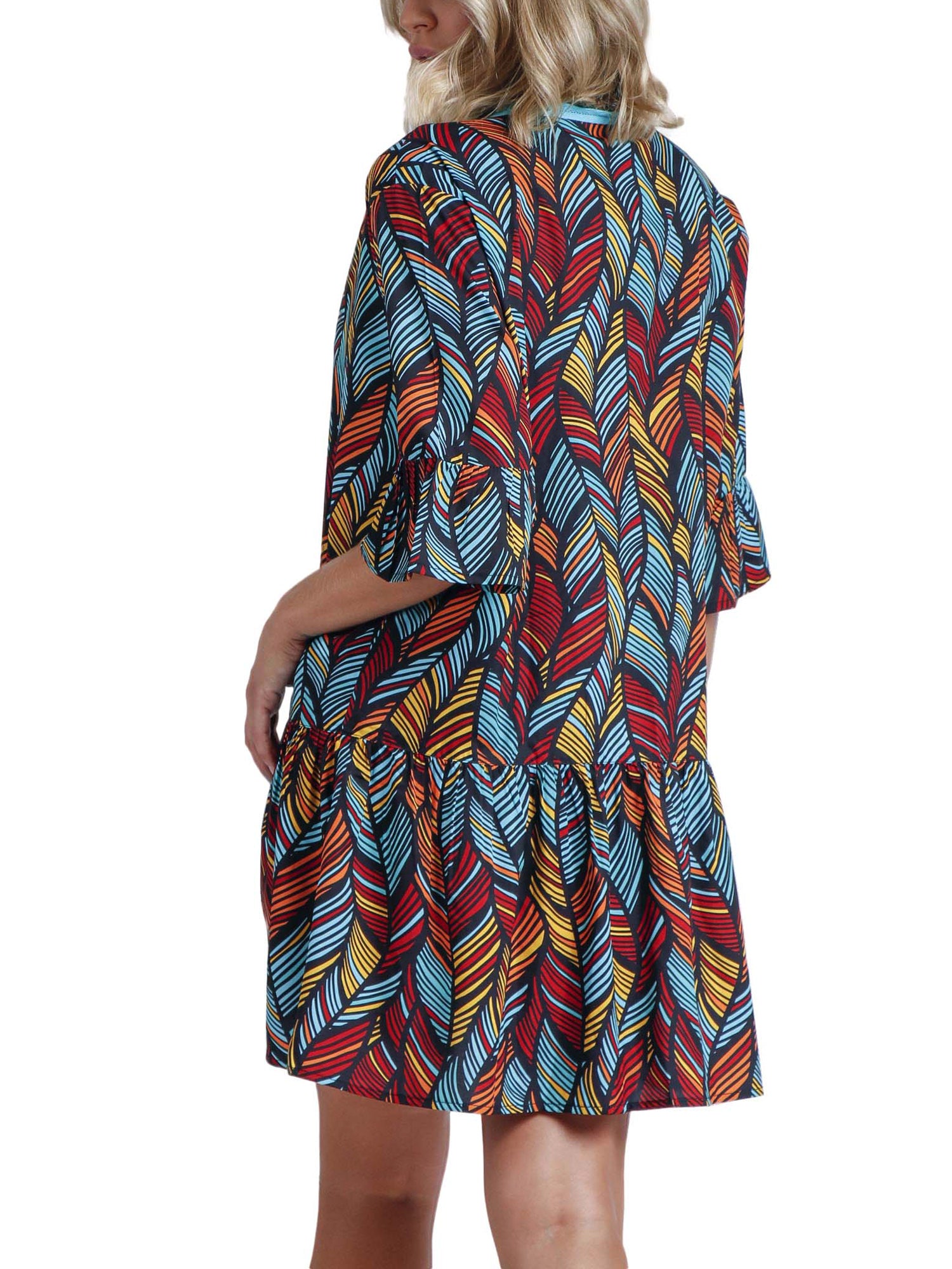 - Imprimé Plumes Éclatant : Des couleurs vives et des motifs de plumes pour un look léger et lumineux.