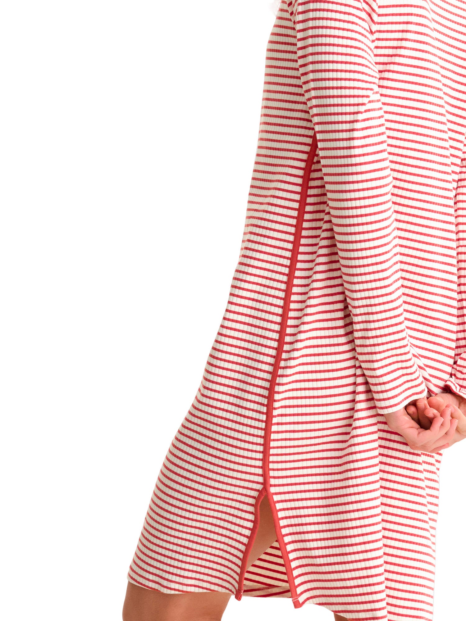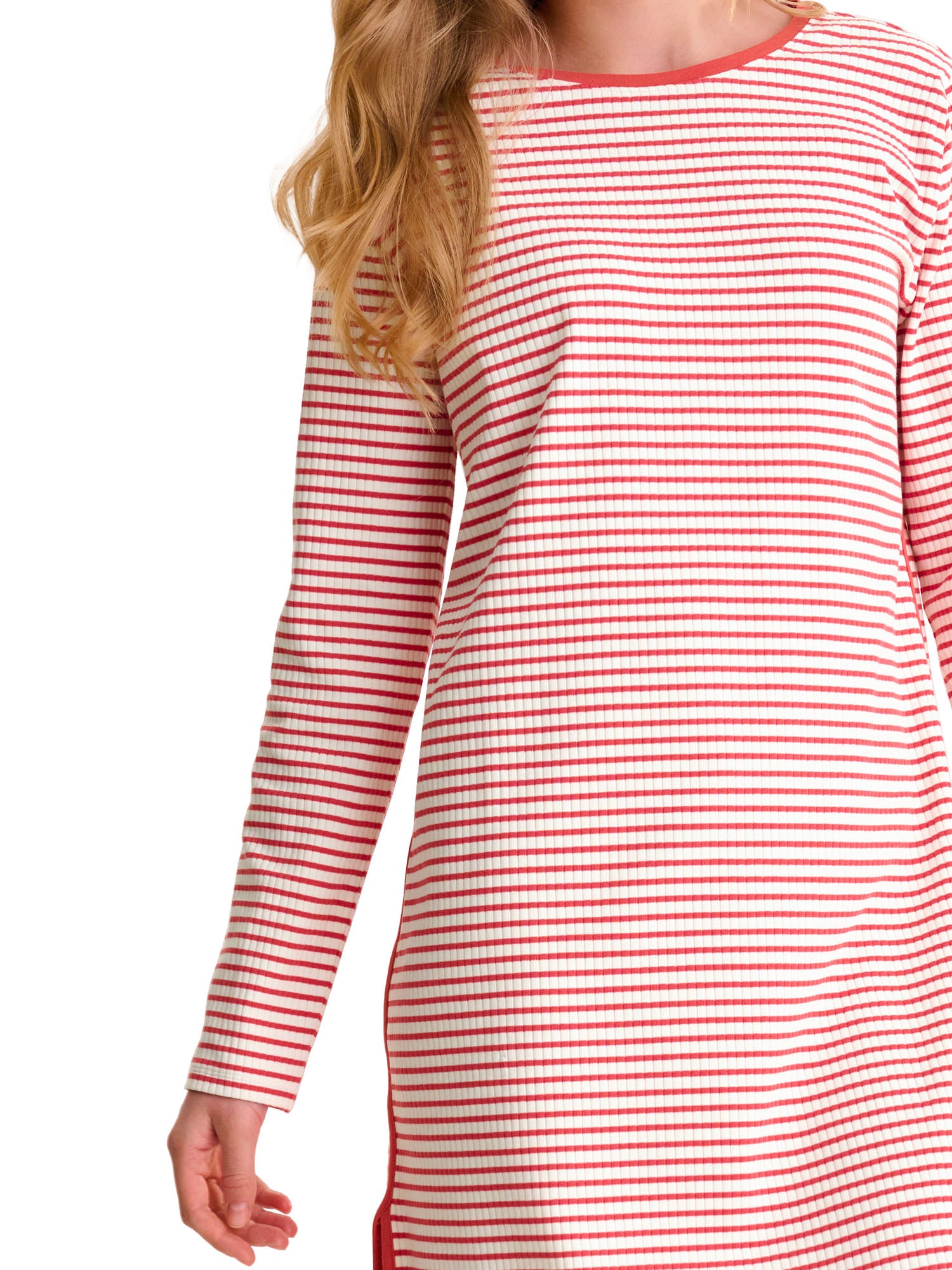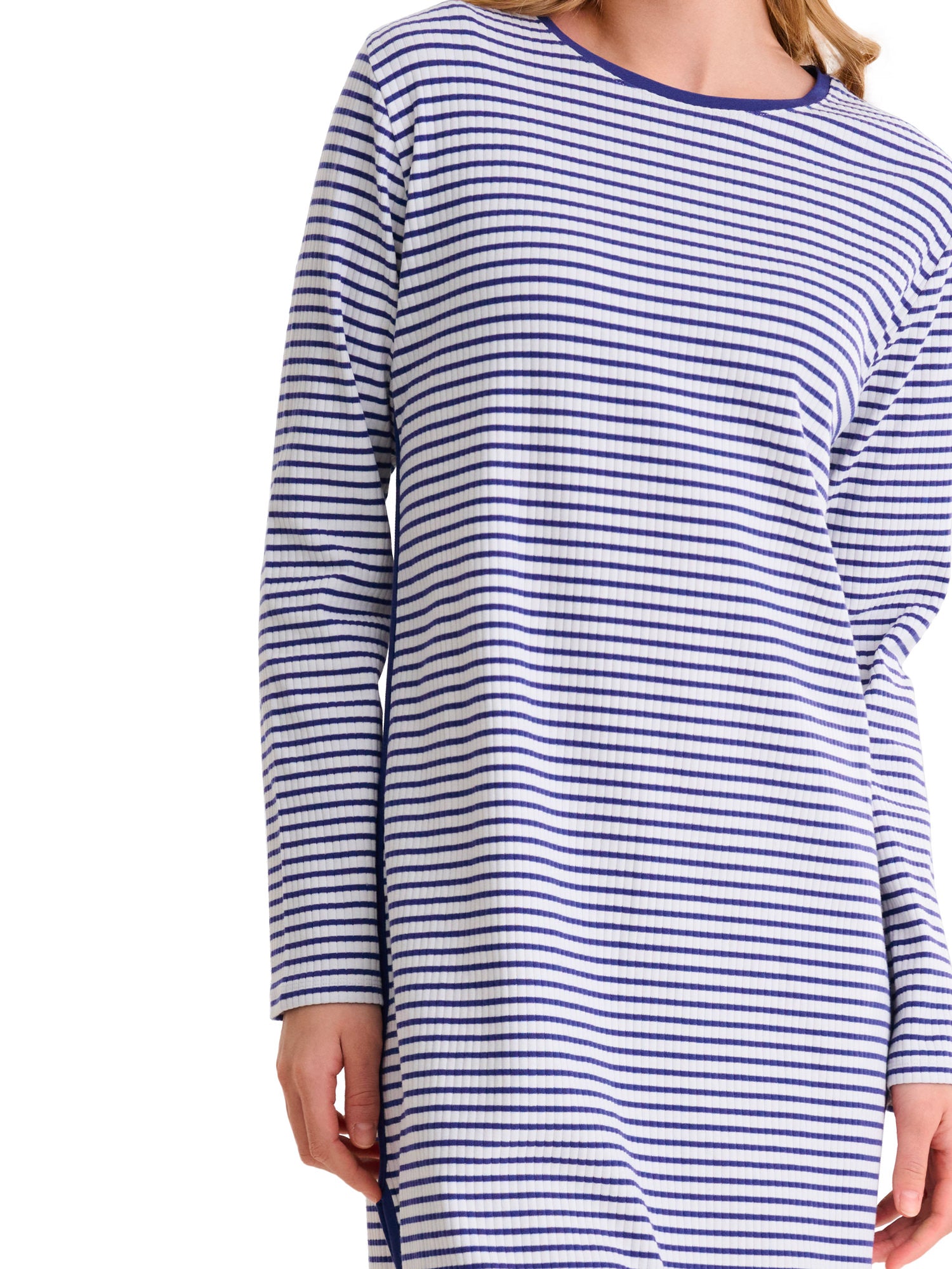 La chemise de nuit simple à manches longues et col rond est confectionnée dans une maille côtelée douce. Elle comporte des fentes latérales et atteint une longueur d’environ 95 cm, pour allier aisance et couvrance minimaliste.
