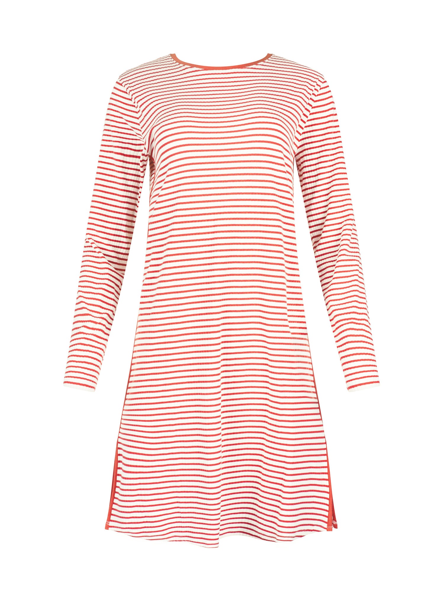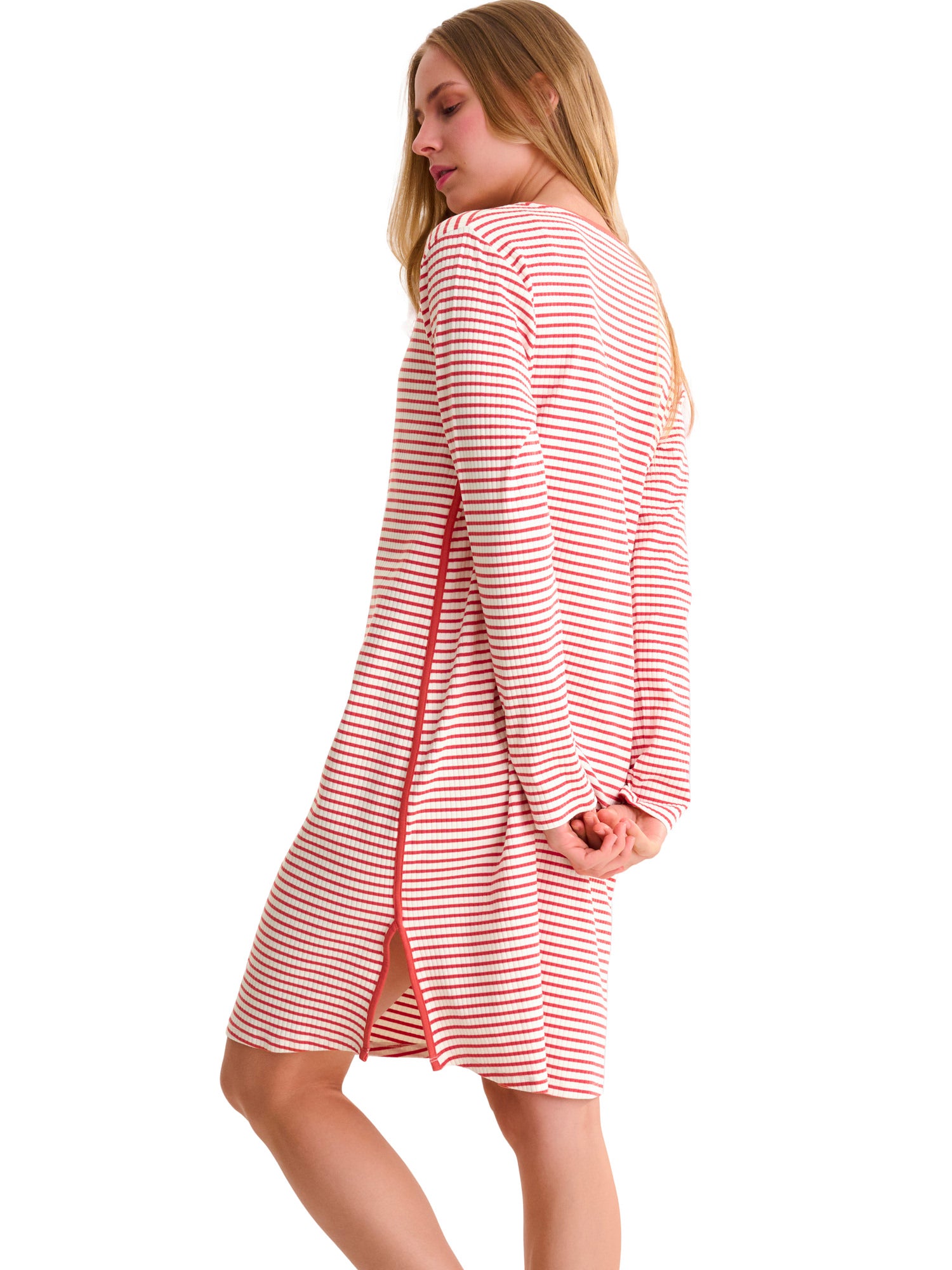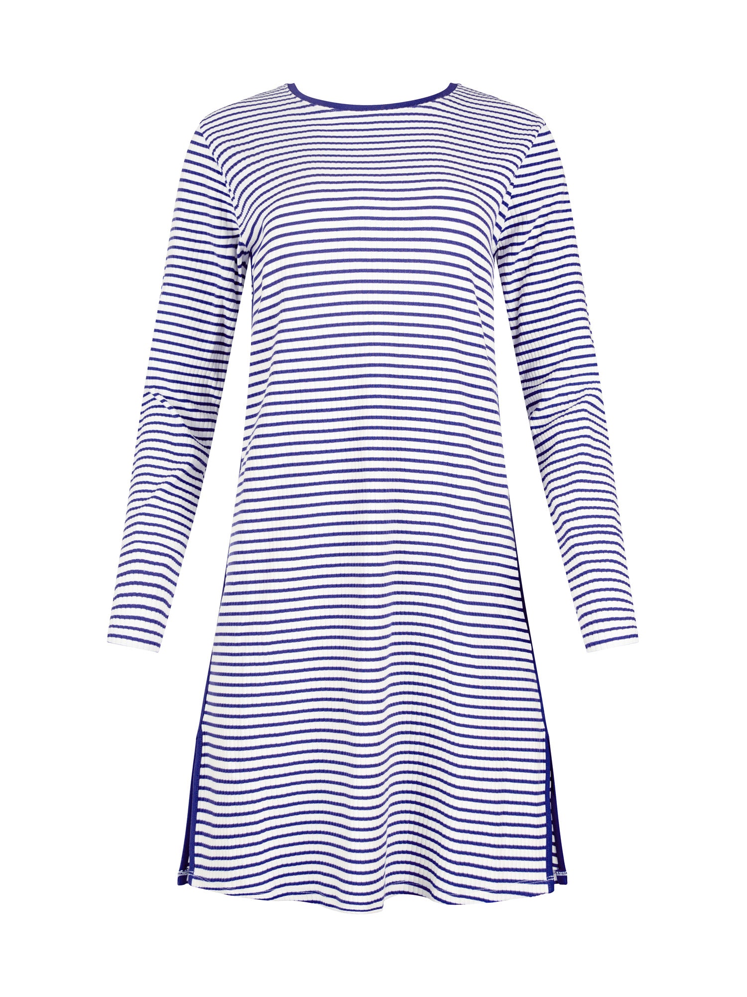 La chemise de nuit simple à manches longues et col rond est confectionnée dans une maille côtelée douce. Elle comporte des fentes latérales et atteint une longueur d’environ 95 cm, pour allier aisance et couvrance minimaliste.