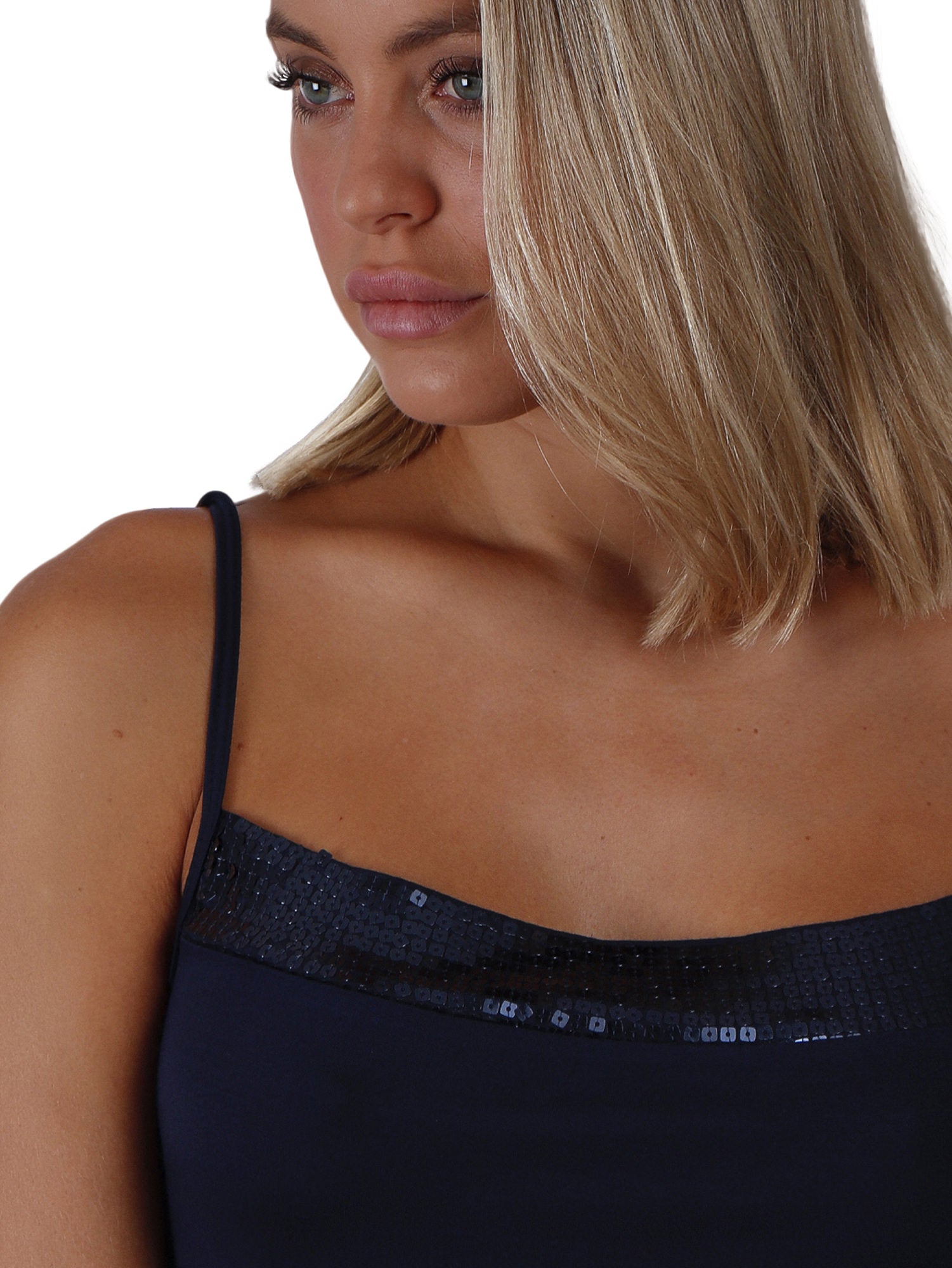 Ce débardeur à fines bretelles combine un style classique avec une touche d'éclat grâce à son encolure droite ornée d'une bande de sequins brillants. Polyvalent et facile à porter, il s'associe harmonieusement avec divers bas de votre garde-robe, que ce soit un pantalon classique, un jean décontracté ou une jupe élégante. Son design intemporel et ses couleurs sobres en font une pièce essentielle pour toutes les occasions.