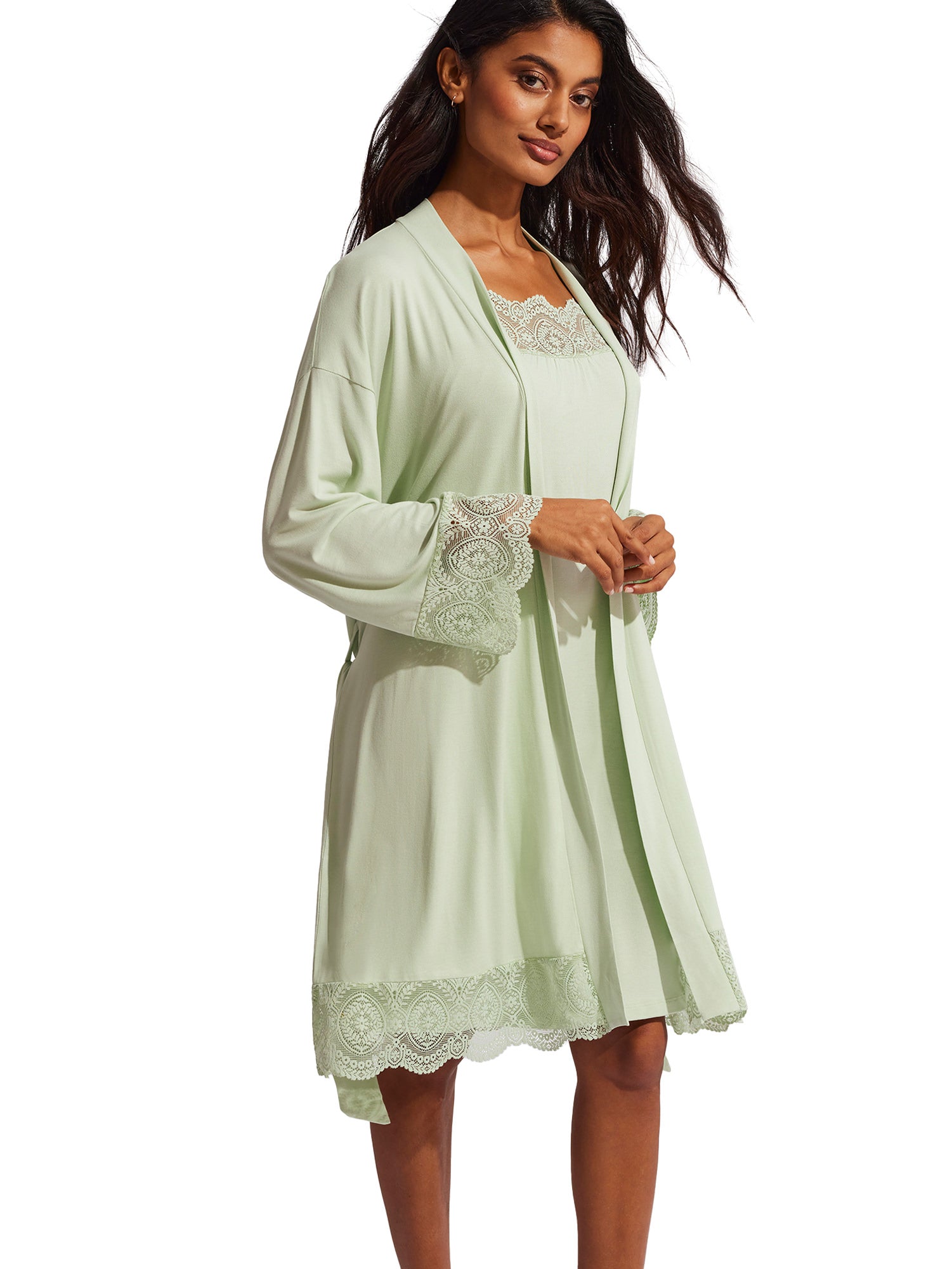- Dentelle Délicate : Les inserts de dentelle délicate au niveau des manches et en bas du déshabillé ajoutent une touche d'élégance et de sensualité, rehaussant son esthétique romantique.