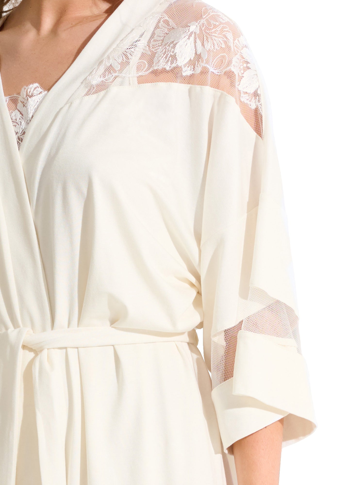 Manches : 3/4 larges avec empiècement en maille transparente.