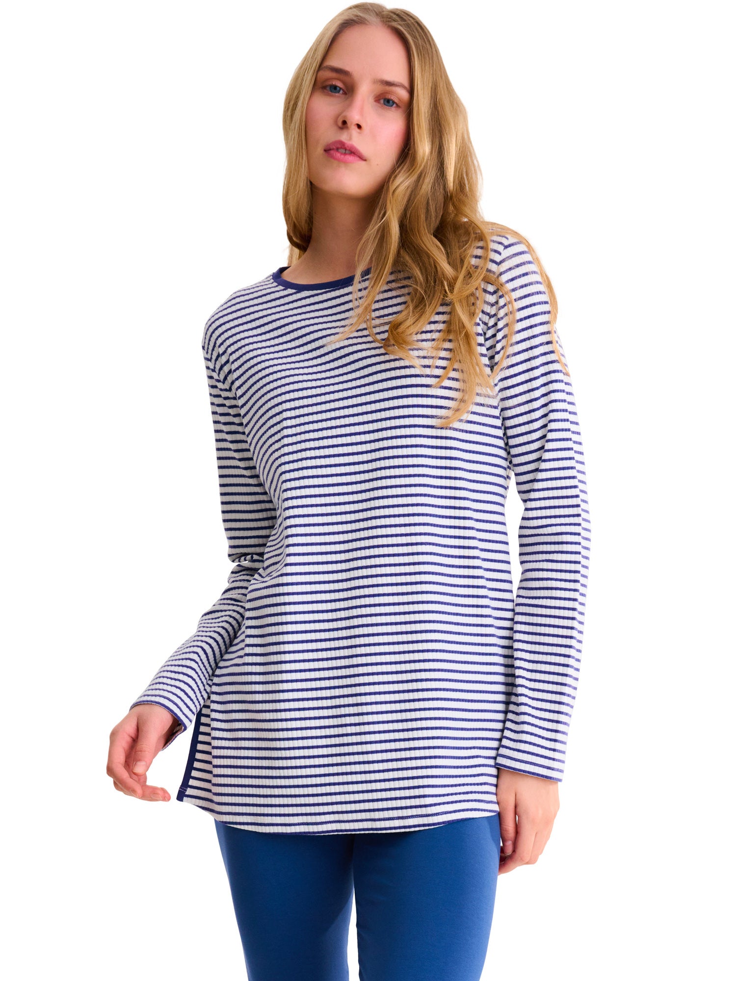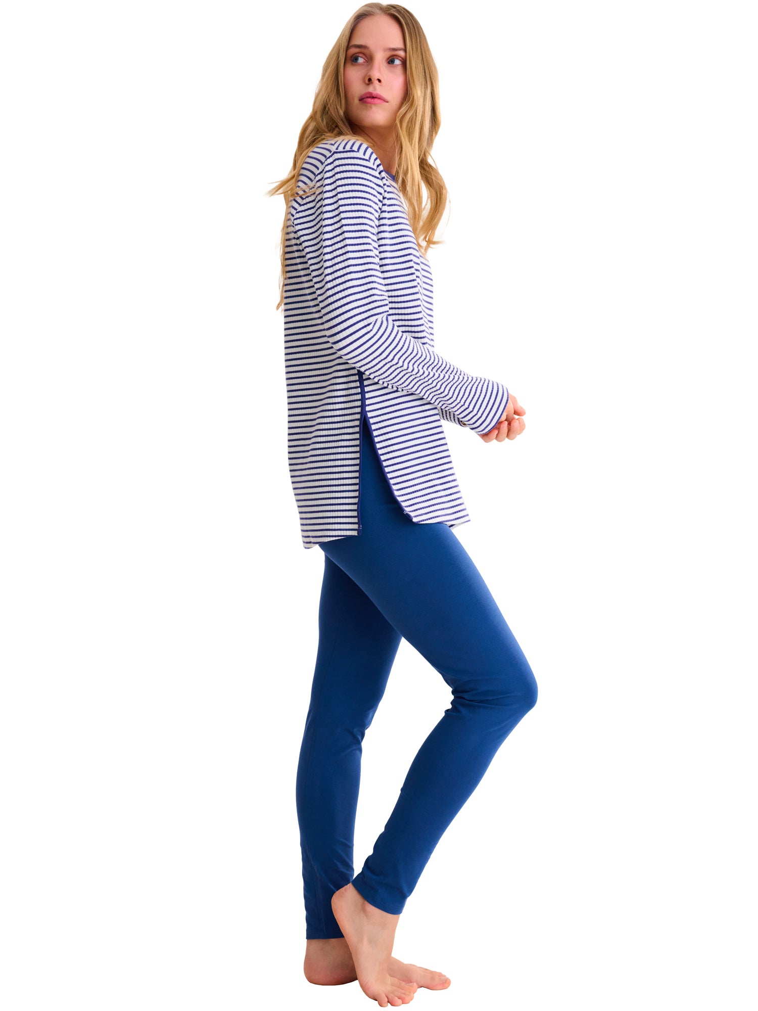 Le pyjama se compose d’une tunique longue à manches longues et col rond en maille côtelée douce, agrémentée d’une fente sur le côté droit pour une touche féminine. Le pantalon est un legging moulant doté d’un large élastique à la taille garantissant un ajustement parfait.
