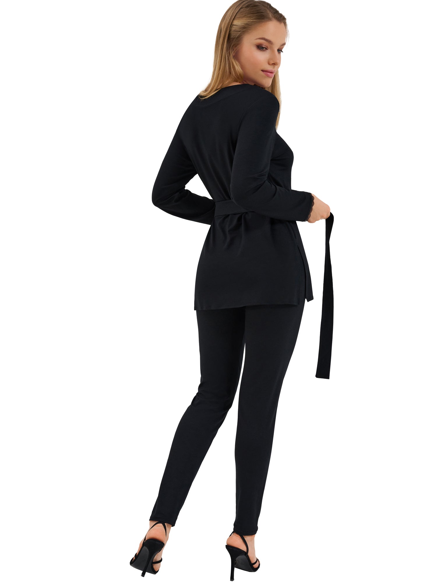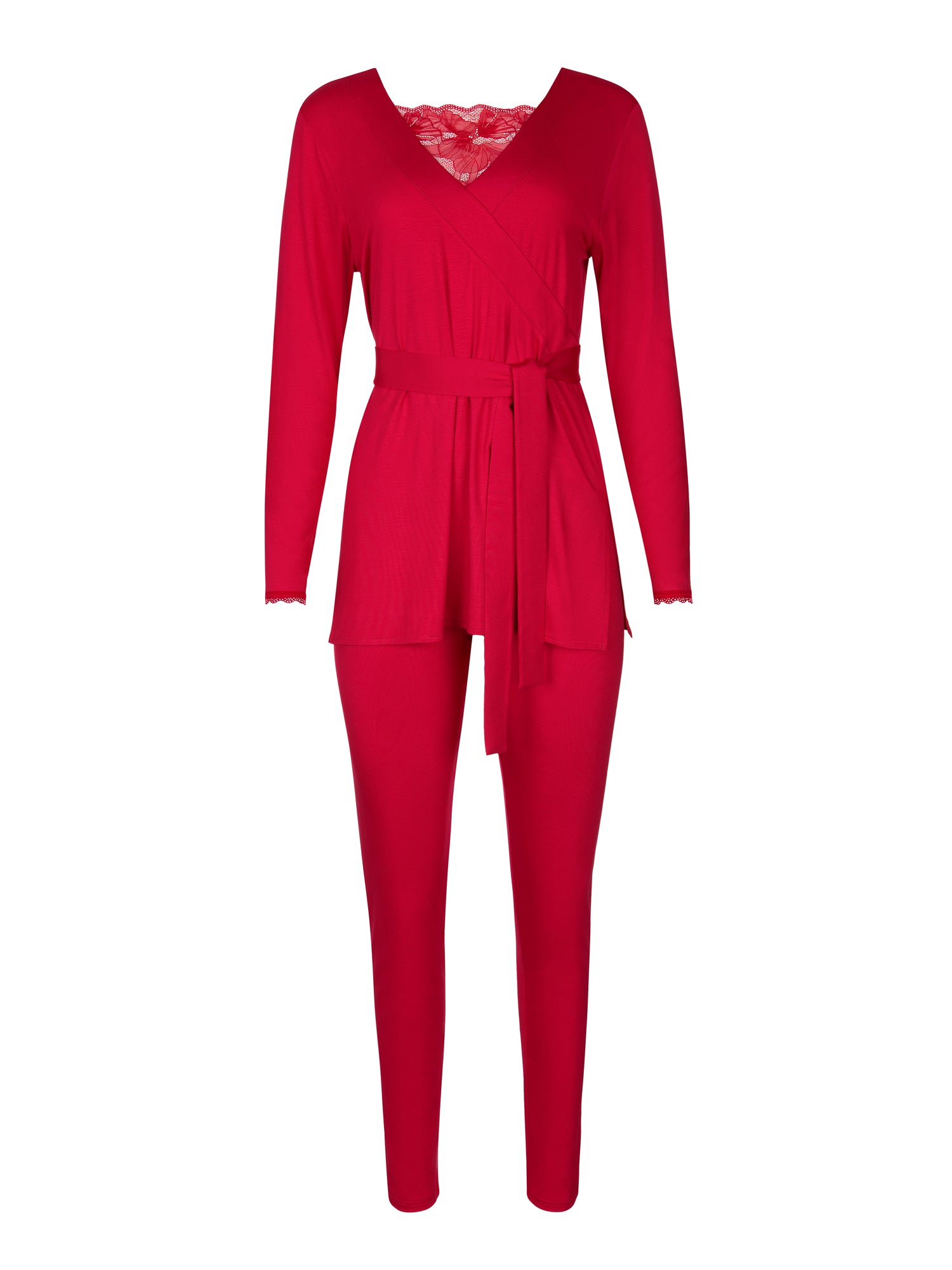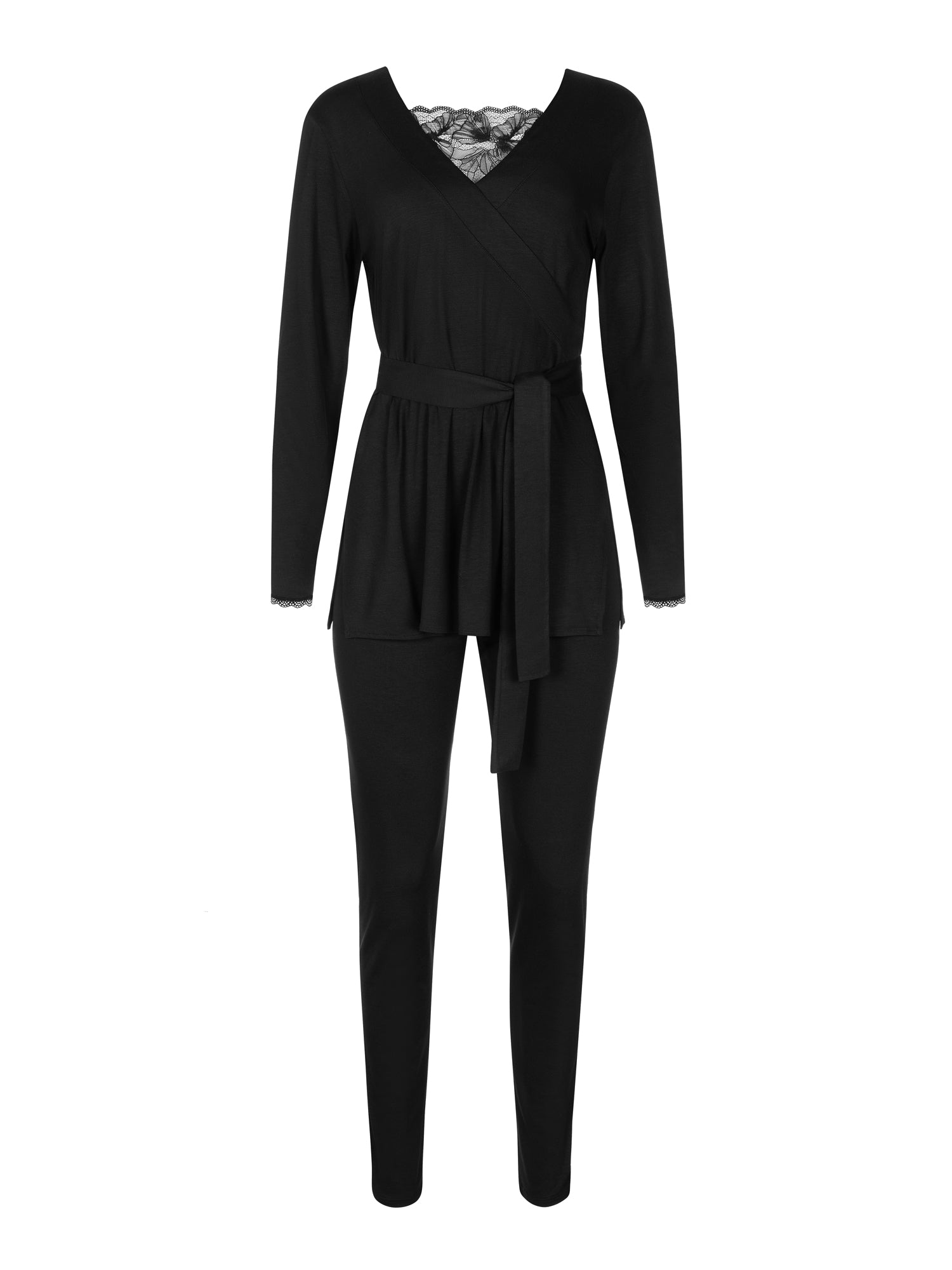 - Cet ensemble de pyjama comprend une tunique moderne à manches longues et un pantalon leggings ajusté, offrant un mélange parfait de confort et de style. Les manches et l'encolure en V sont ornées de délicates bordures en dentelle, apportant une touche de sophistication à l'ensemble.