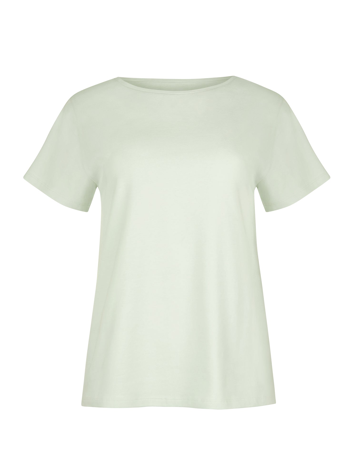 Le haut est un t-shirt à manches courtes monochrome, apportant simplicité et élégance.