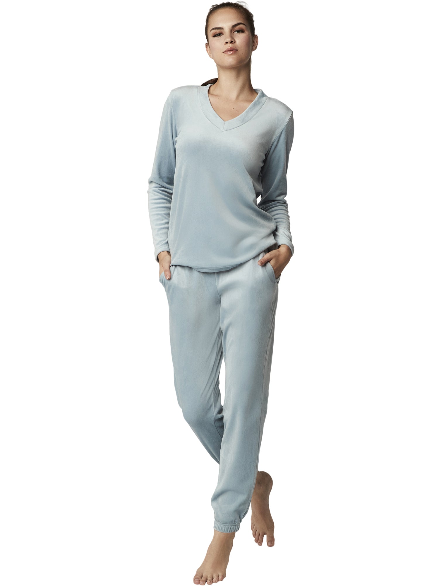- Col en V : Le haut à manches longues présente un col en V qui apporte une touche de féminité, parfait pour se sentir élégante même en mode détente.