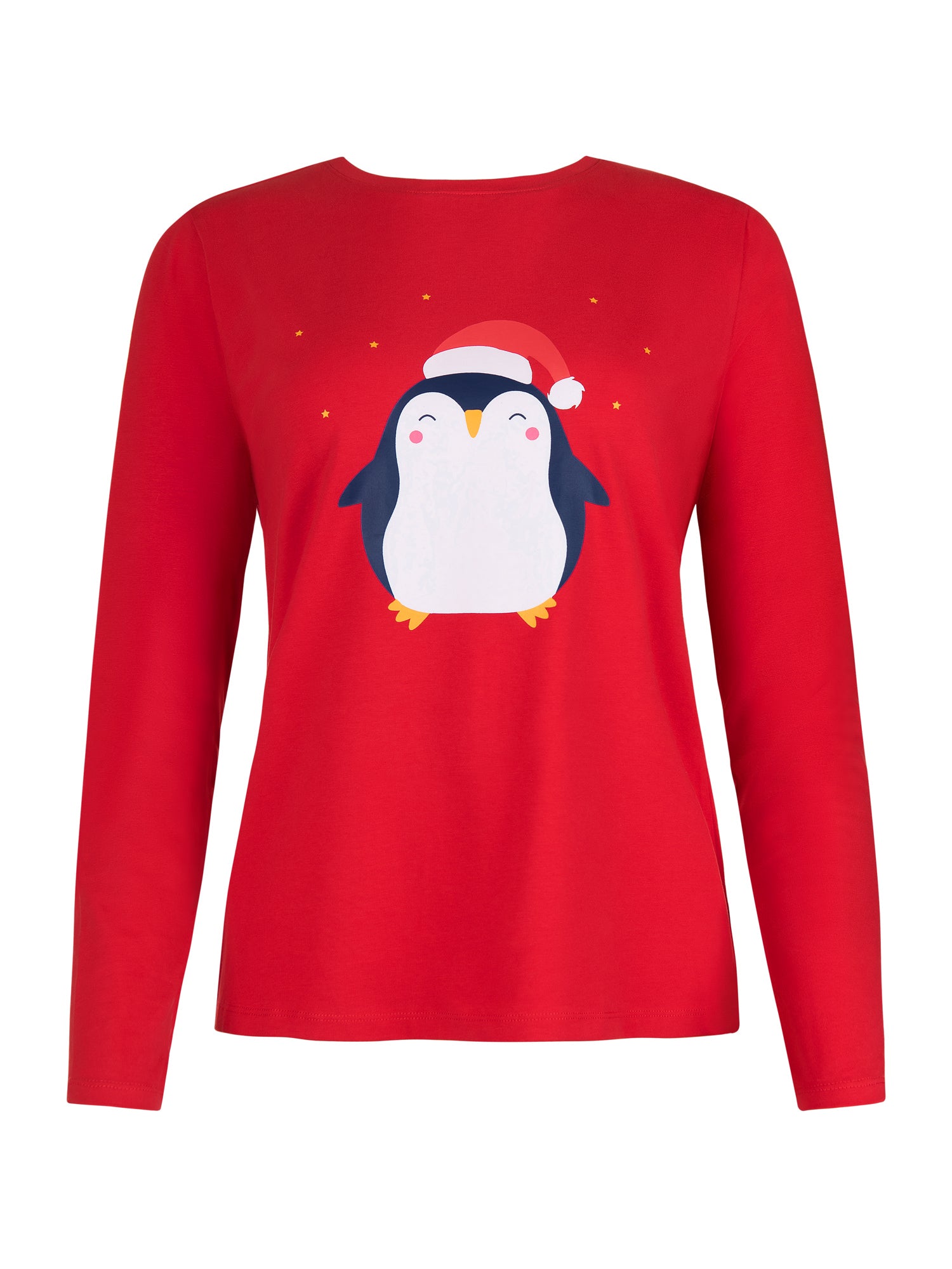 - Le top présente une encolure ronde classique, orné d’un motif pingouin adorable, coiffé d’un bonnet de Noël rouge, pour une touche festive amusante.