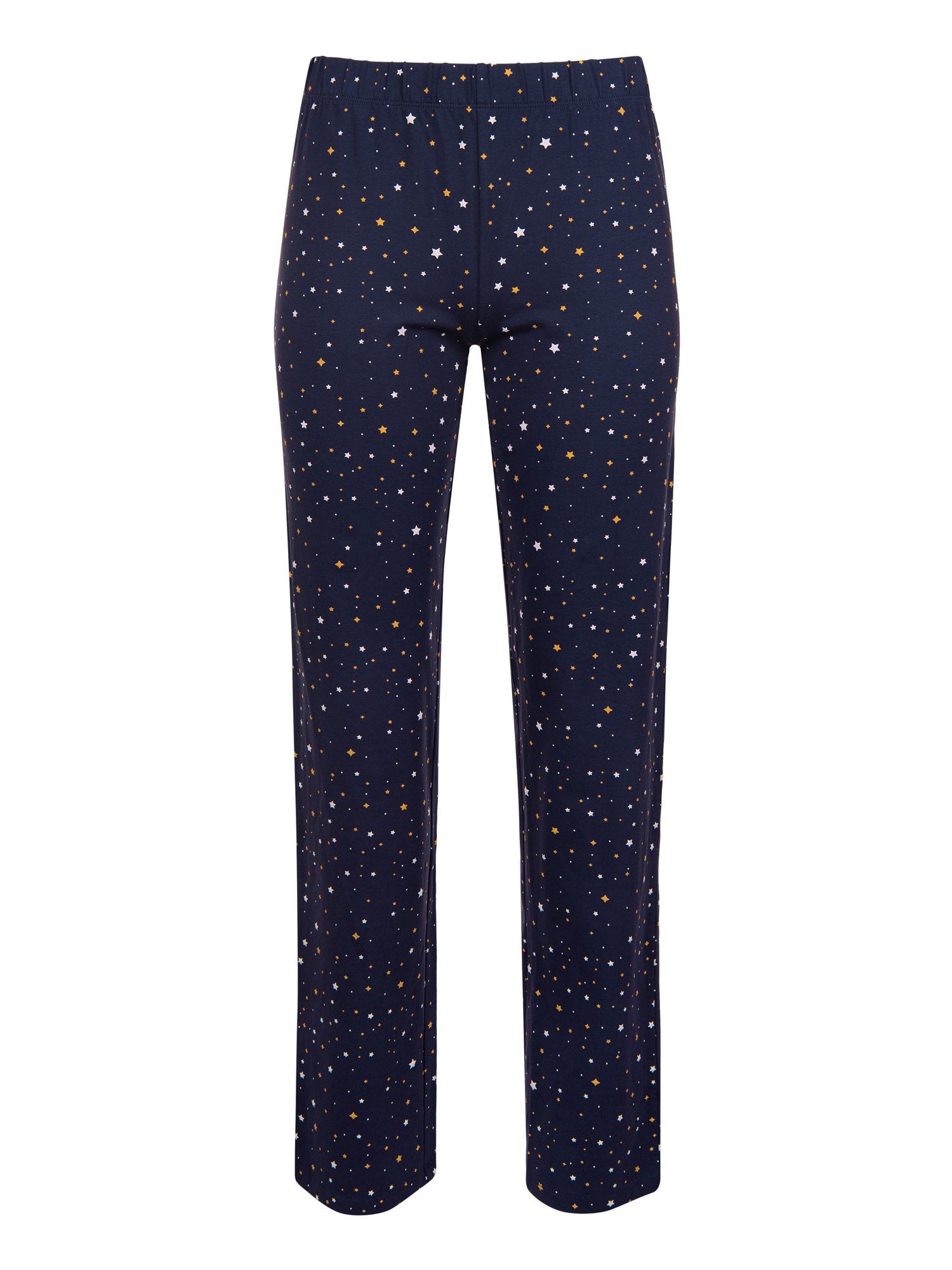 - Le bas est un pantalon droit avec un imprimé étoilé sur fond sombre, apportant un équilibre parfait entre fantaisie et confort.
