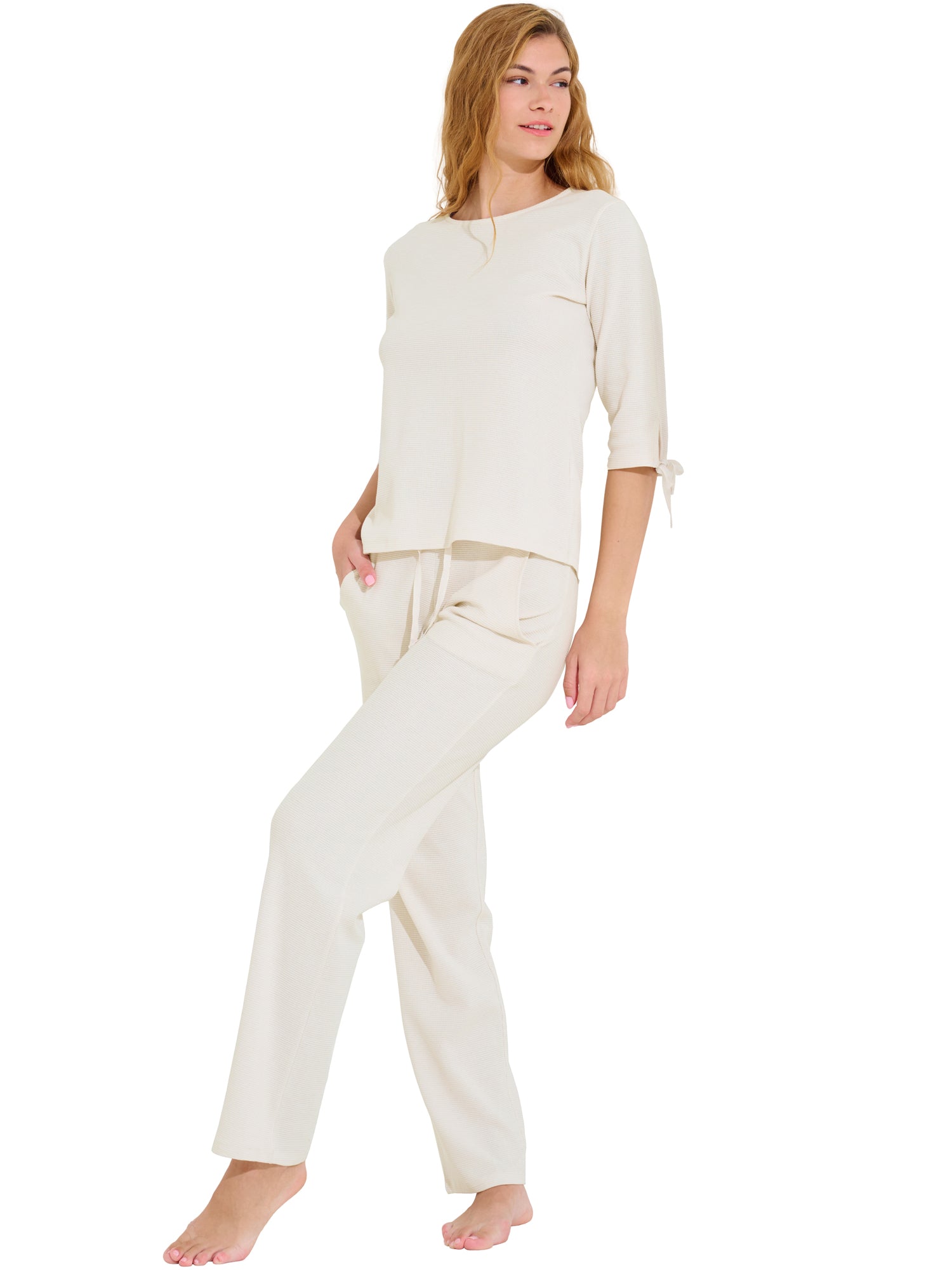 Design : Ensemble composé d'un haut à manches trois-quarts et d'un pantalon long. Le top est facile à porter avec une coupe confortable et son encolure ronde. Il est orné d'un cordon décoratif sur les manches. Le bas est un pantalon long à coupe droite, avec une large ceinture élastique et un cordon de fermeture pour un ajustement parfait. Poches pratiques sur les côtés.