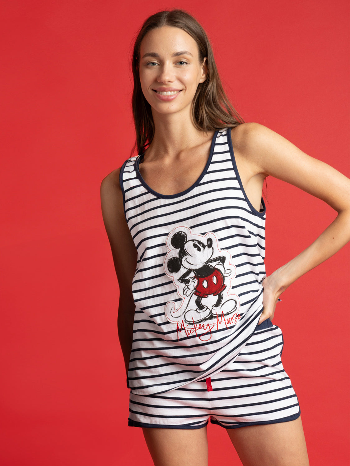 Style ludique et marin : Look original avec des rayures horizontales tissées et une applique Mickey Disney brodée sur l'avant.