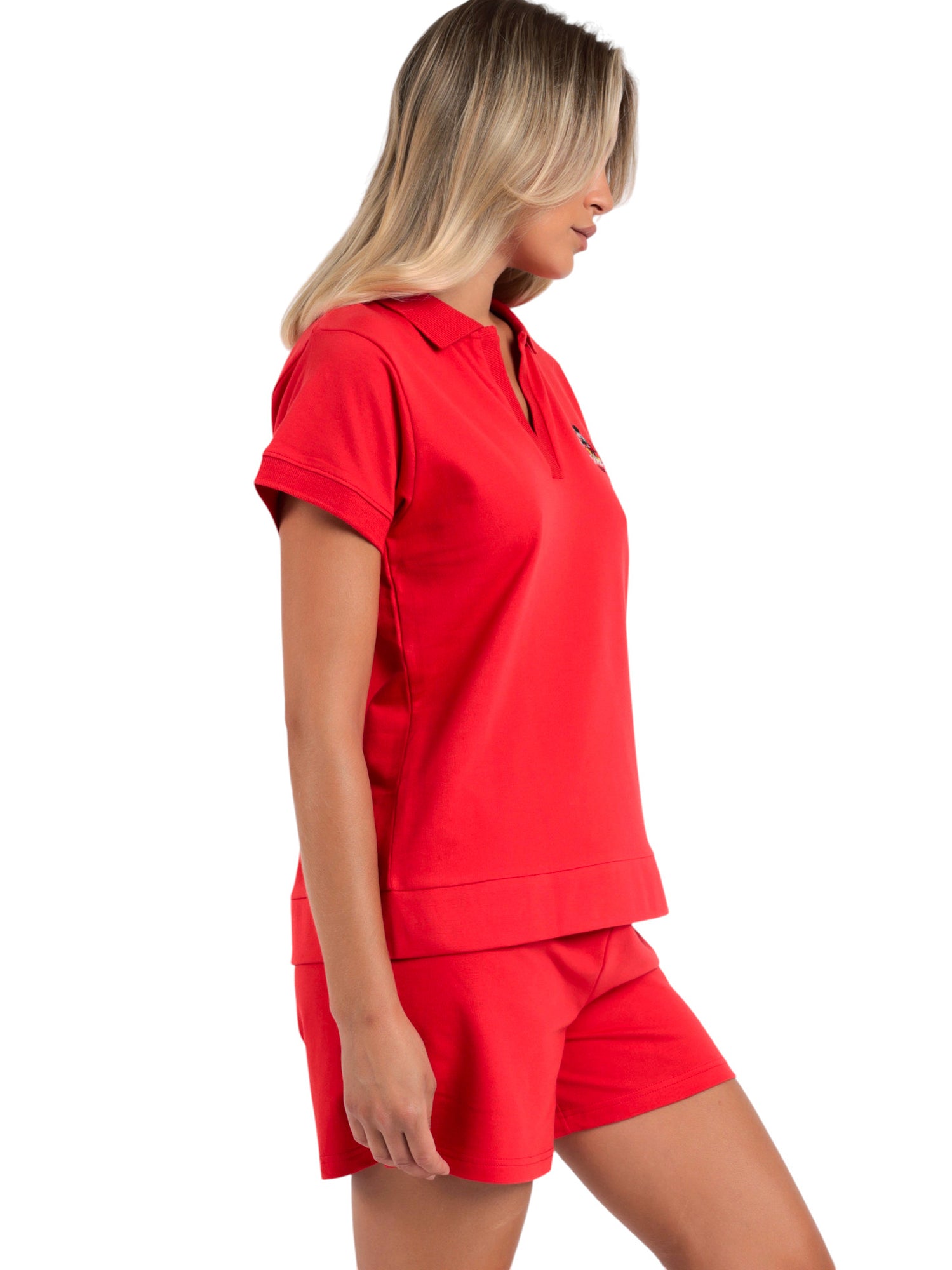 Haut type polo : À manches courtes, avec un col en V, orné d'une petite broderie Mickey Disney sur le buste.