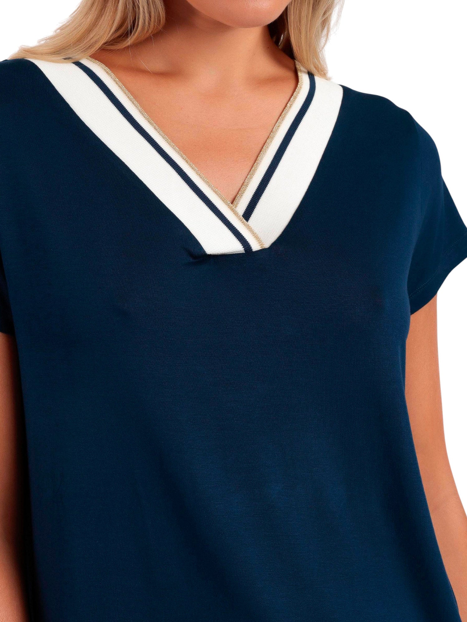 T-shirt à Manches Courtes Le t-shirt, confectionné en tissu viscose mélangé (5% elasthanne, 95% viscose), apporte confort et légèreté grâce à sa douceur sur la peau. Il est orné sur l'avant d'un col en V de couleur contrastée, accentué par de fins passepoils colorés, une attention qui apporte une note de raffinement et de sophistication à l'ensemble.