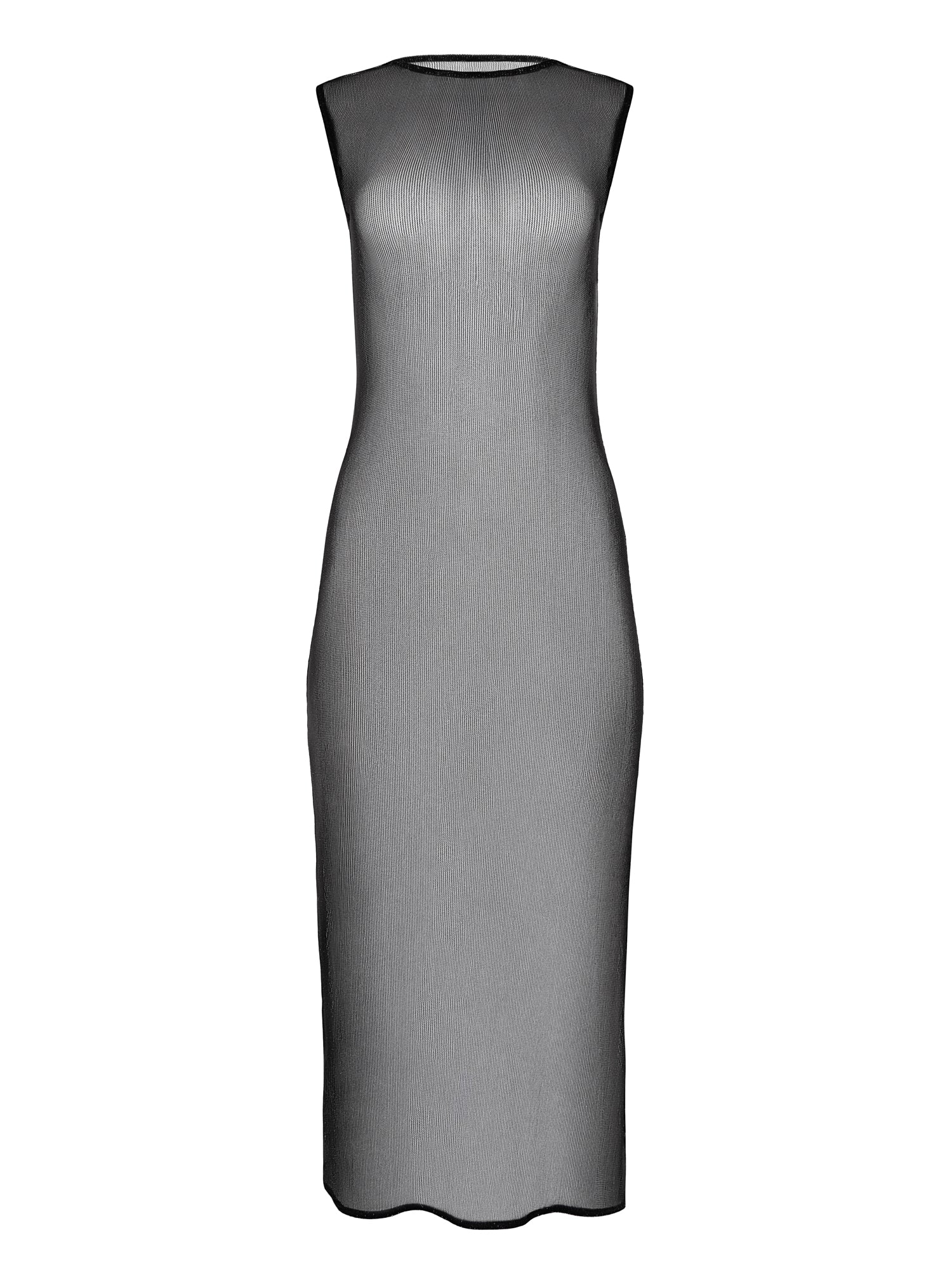 Robe moulante, sans manches, entièrement confectionnée en maille pailletée transparente, douce et élastique pour un confort optimal.