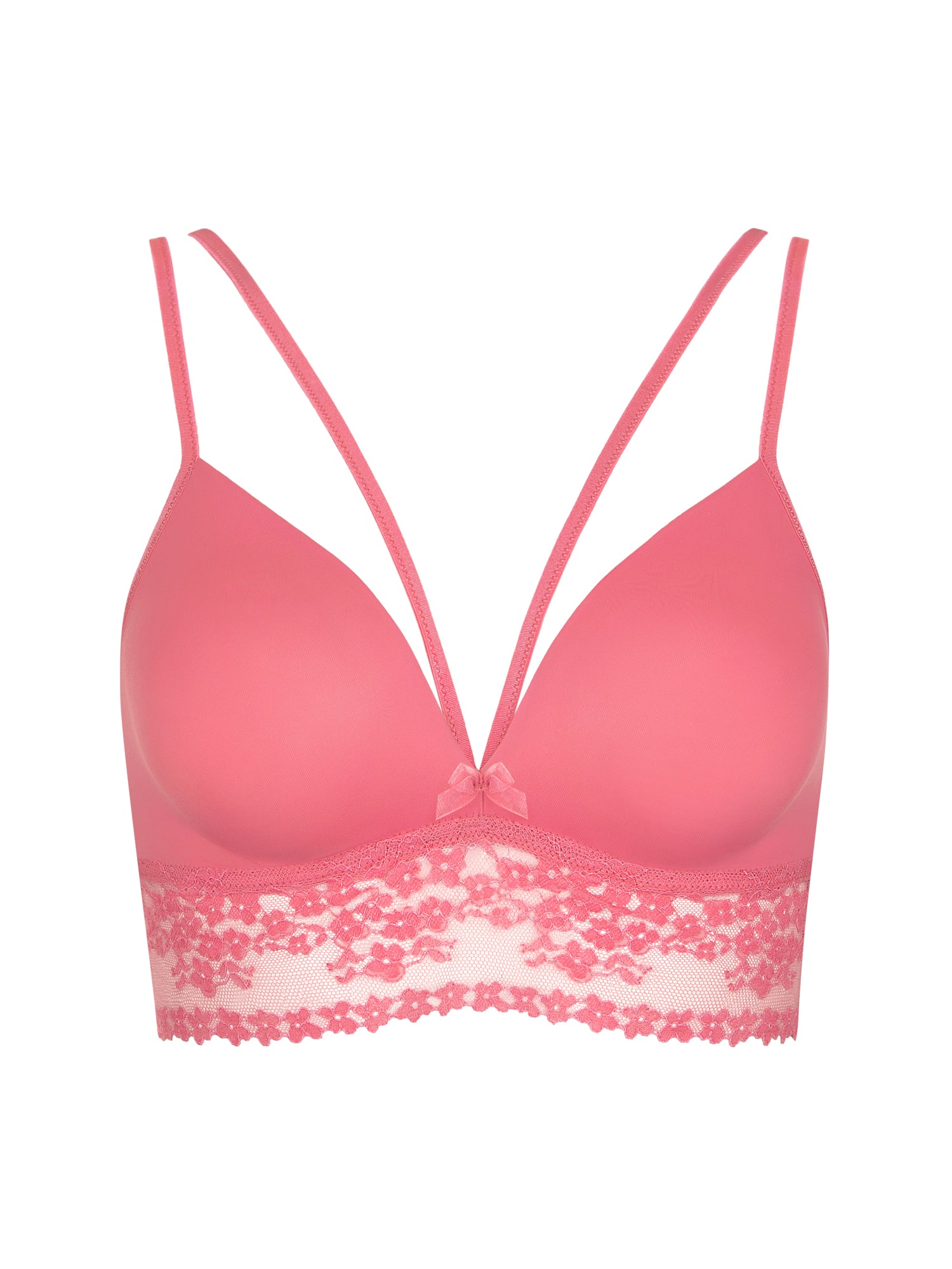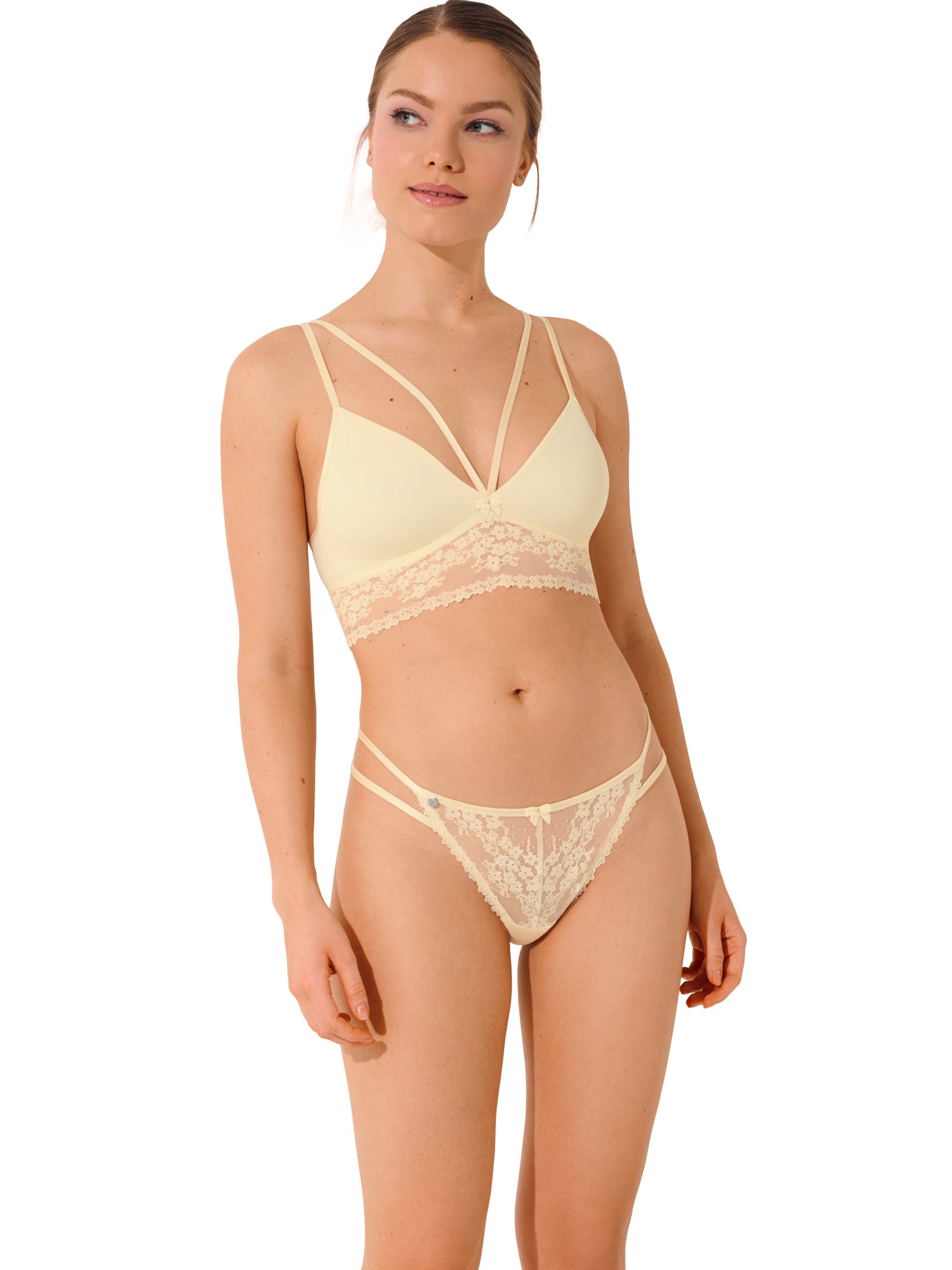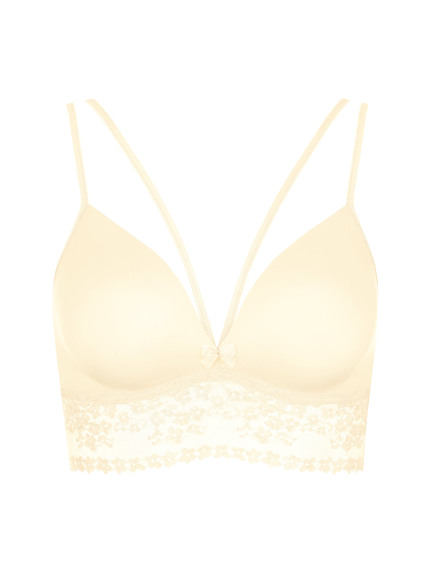 Design : Bralette léger non rembourré à double bonnet avec maintien. Dentelle romantique sous le buste pour un look bustier à la mode, avec des bandes décoratives au niveau du décolleté et un nœud décoratif au milieu du devant.