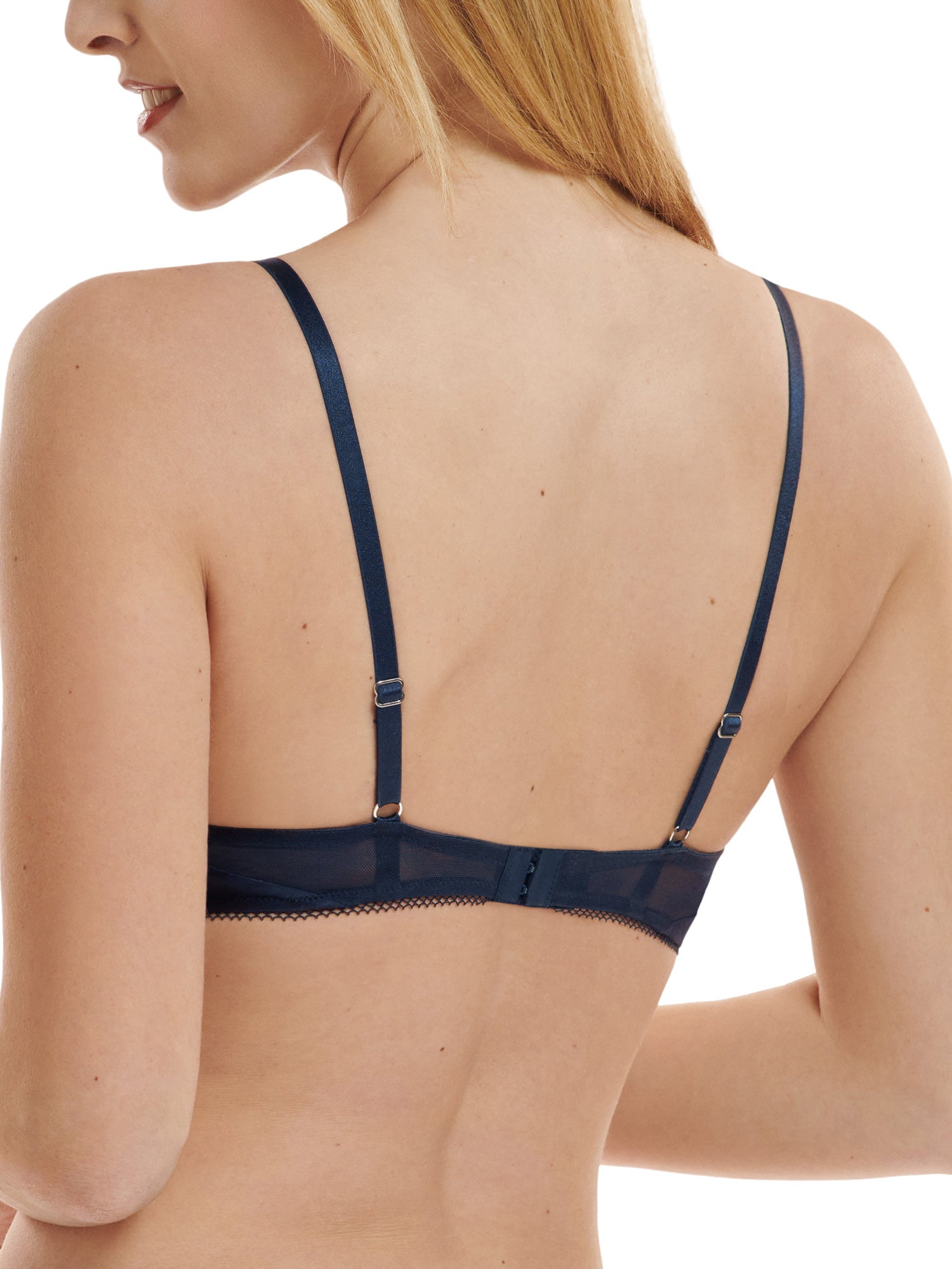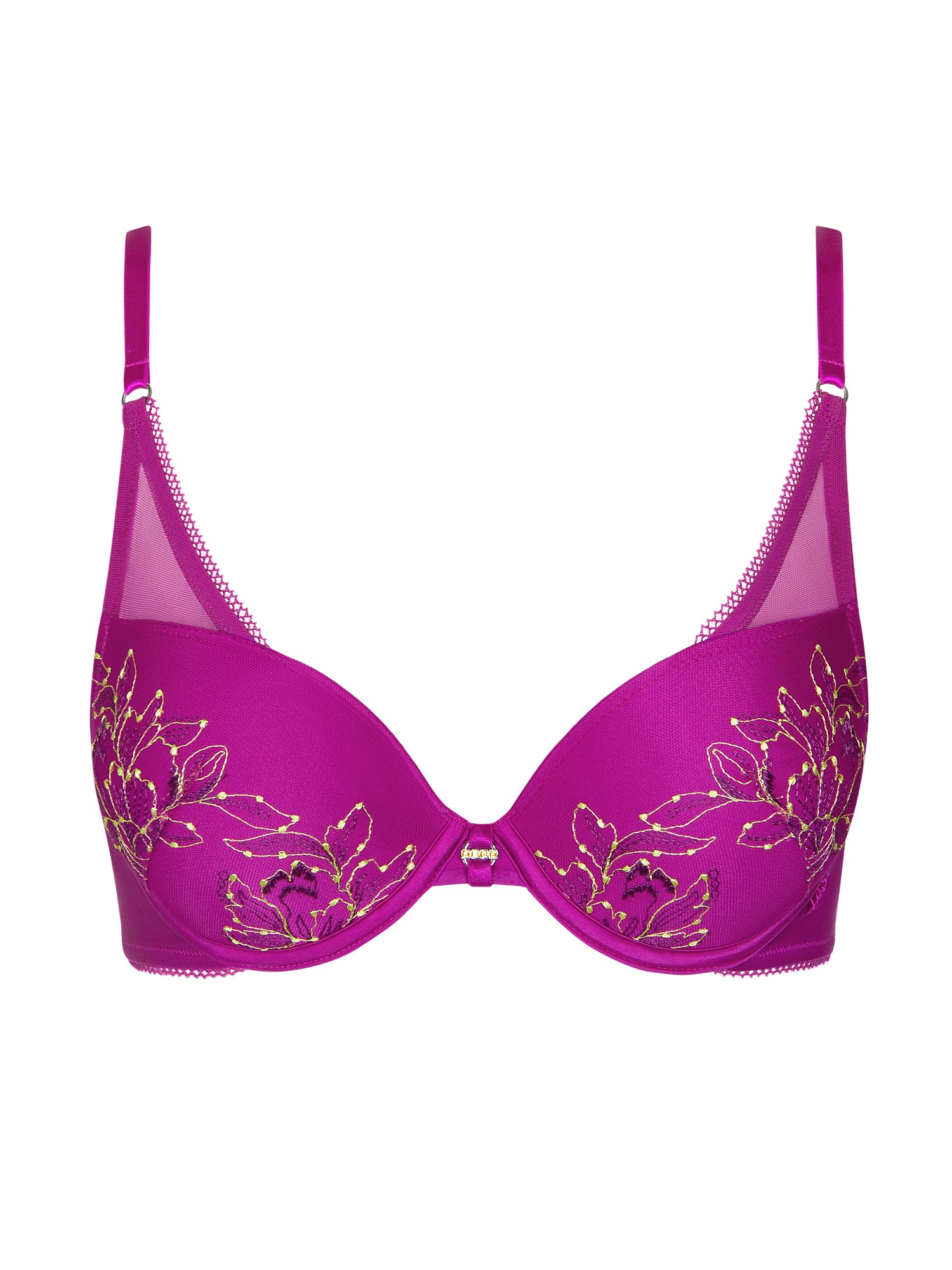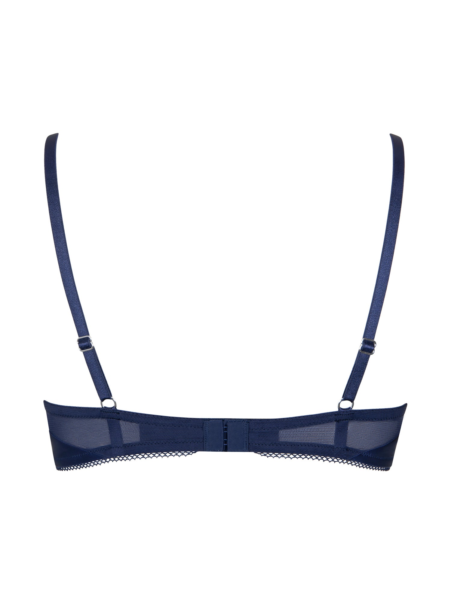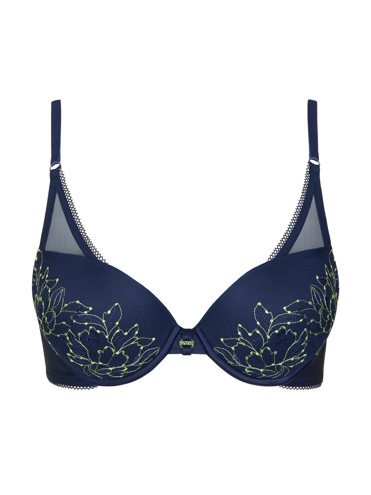 Ce soutien-gorge push-up offre un effet push-up puissant, créant un décolleté remarquablement large et séduisant. Les bonnets sont ornés d'une somptueuse broderie coupée assez haut dans une forme triangulaire moderne, ajoutant une touche de sophistication à votre look. Le dos partiellement transparent est doublé pour assurer un ajustement optimal et un confort accru.
