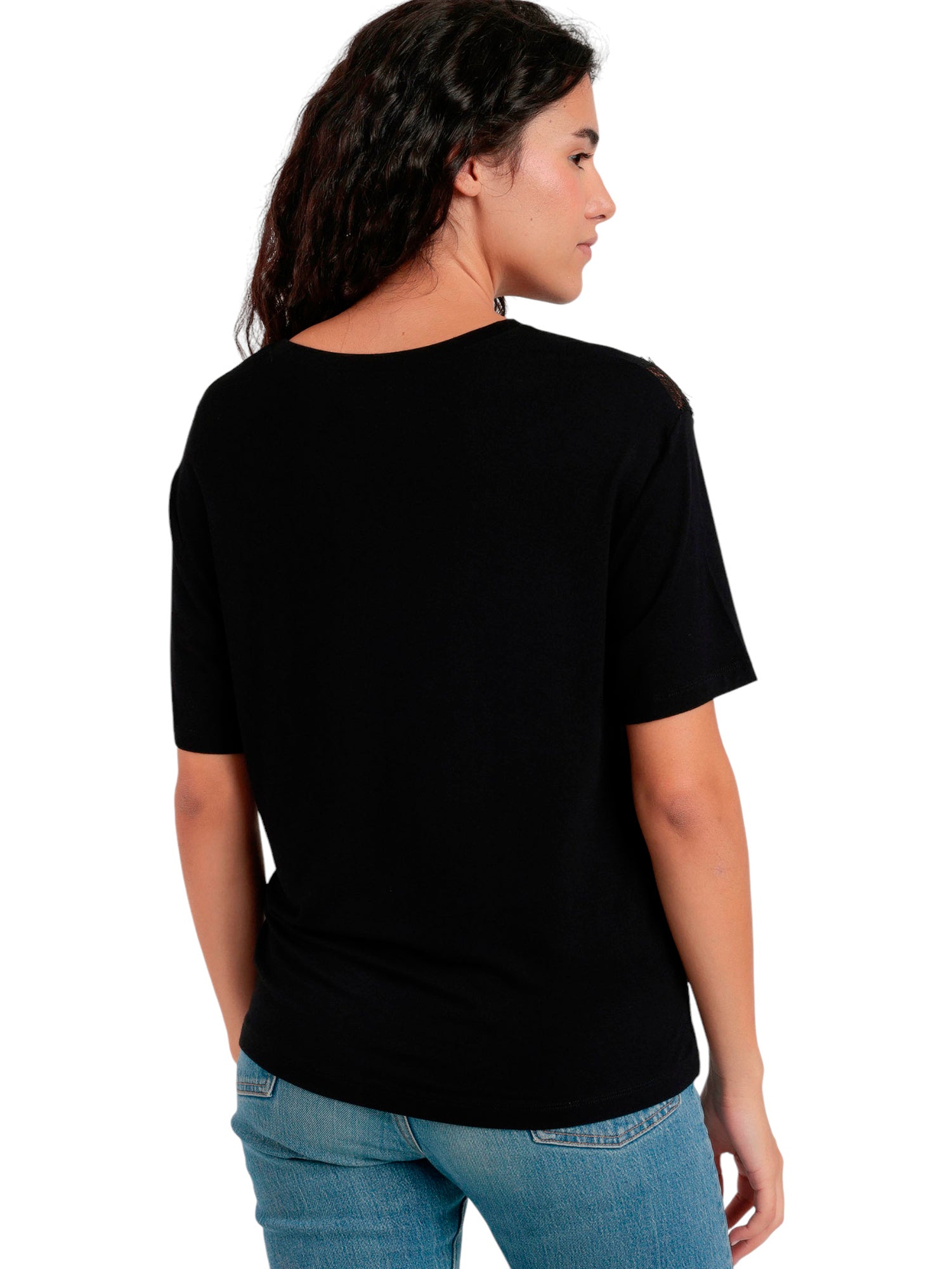 T-shirt doté de détails en dentelle transparente sur l'avant, formant un V délicat, qui ajoute une touche féminine et élégante.