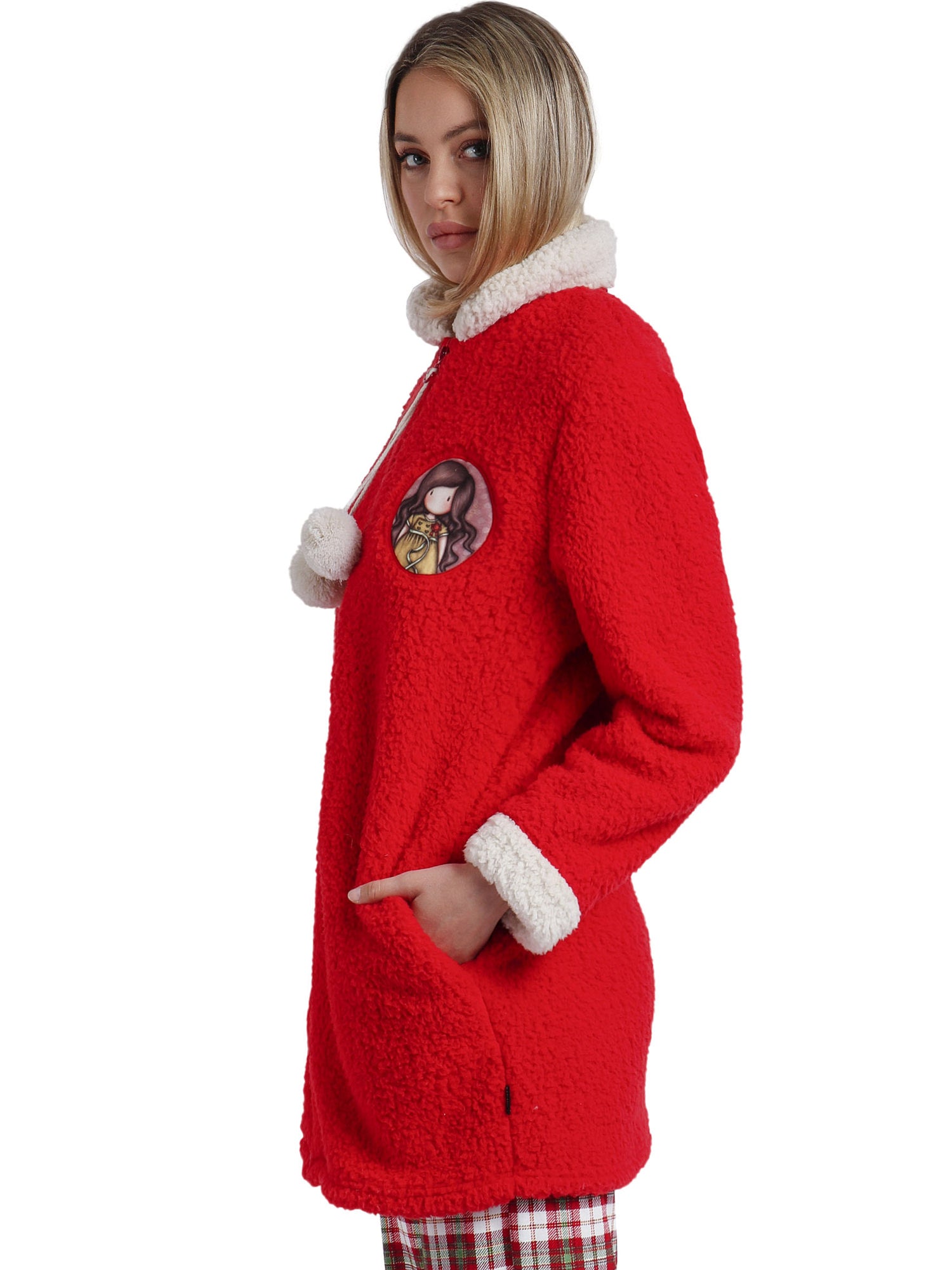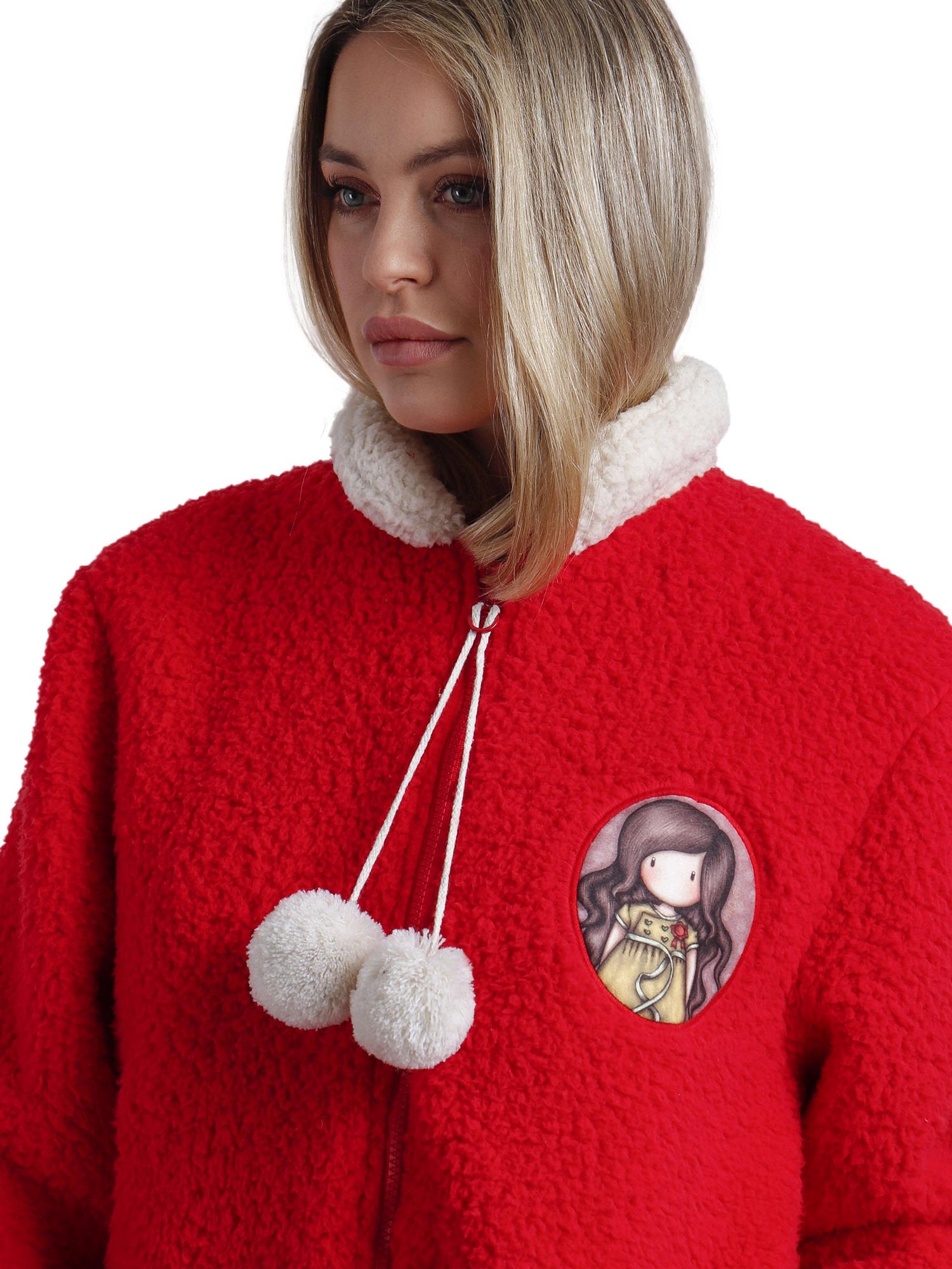 Fermeture et Finitions Ludiques La veste se porte fermée grâce à une fermeture éclair à zipper sur le devant, agrémentée d'une languette décorée de pompons suspendus pour une note ludique. Les pompons, le col et les bordures des manches affichent une couleur contrastée, soulignant le design tout en apportant une touche dynamique.